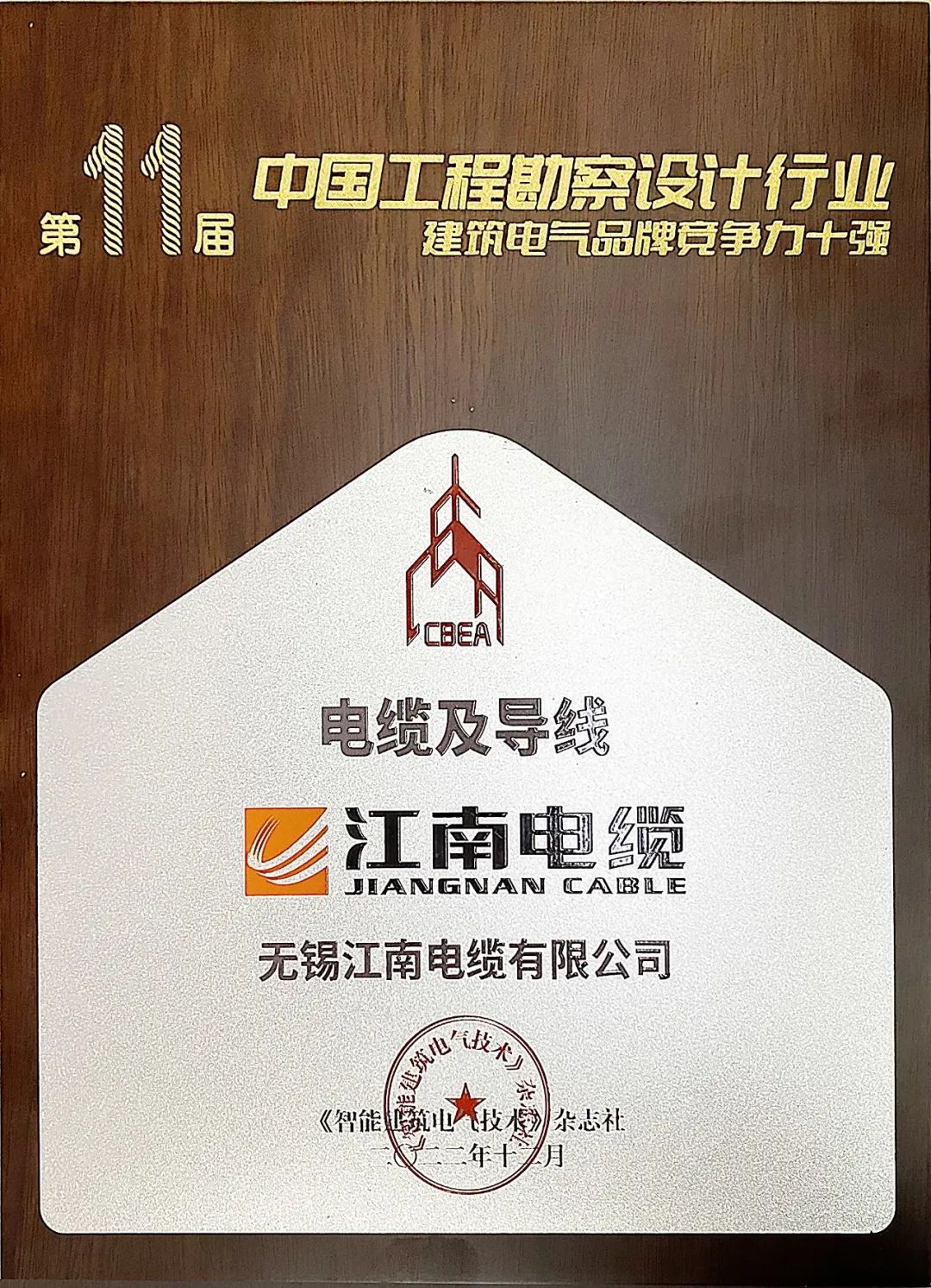江南電纜榮獲第11屆建筑電氣品牌競(jìng)爭(zhēng)力十強(qiáng)!